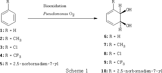 The conversion of benzene into cyclohexa-3,5-diene- cis -1,2-diol (4) by Pseudomonas spp was initially investigated (9) in pioneering work by Gibson. The successful scale up of the biotransformation by Taylor et al. (10,11) that led to the material becoming commercially available for synthetic exploitation. The bio-oxidation of simple benzene derivatives such as toluene (2) and chlorobenzene 3 can also be performed using Pseudomonas, Scheme 1 . A bonus is accrued in stereochemical terms in that these and other similar diene- cis -diols obtained ( e.g. 9 and 10 ) are optically active. In those cases, where the absolute configuration has been elucidated, the 1(S) isomer has been shown to be the major or sole enantiomer.