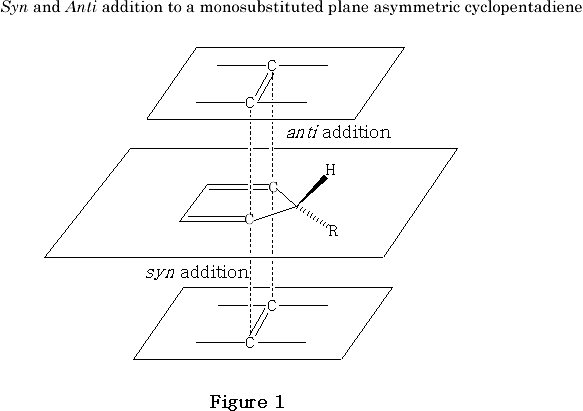 There is an aspect of the stereochemistry of the Diels-Alder reaction which becomes important when the two faces of the p -bond system of the interacting diene and/or dienophile are not equivalent.27-32 This phenomenon manifests itself whenever the plane through the multiple bond system of either one or both of the reactants does not represent a plane of symmetry. In this case the cycloaddition gives rise to adducts that are diastereomers. The two ways of addition are called syn and anti with respect to the group, or structural moiety, which makes the two faces different. The syn and anti additions of a generalised dienophile to a monosubstituted cyclopentadiene are illustrated in Figure 1 .