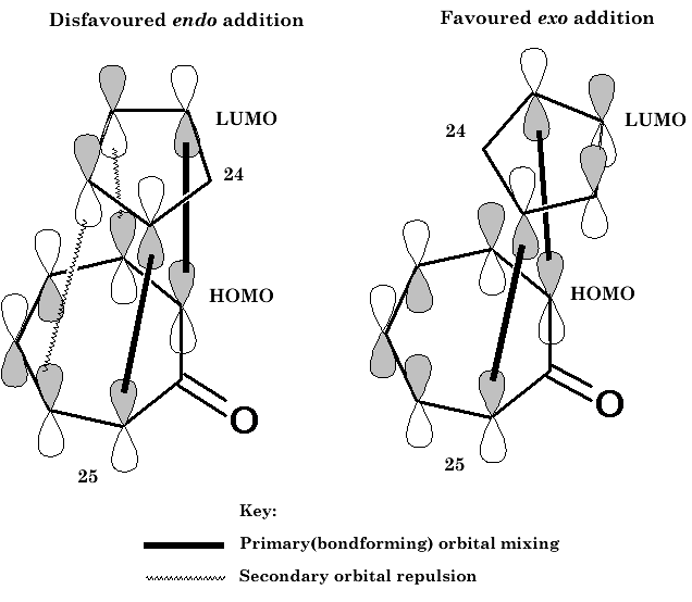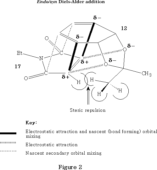 It may be surmised that many different interactions can be operating to determine syn/anti selectivity during the early stages of transition state formation in appropriate Diels-Alder reactions, depending on the nature of the atom centres involved in the cycloaddition process and relevant substituents in either the diene or dienophile. The suspected interplay of various conflicting forces and effects is shown diagrammatically in Figure 2 , which depicts the dienophile 17 lining up during the early stages of the transition state prior to endo/syn cycloaddition to diene 12 .