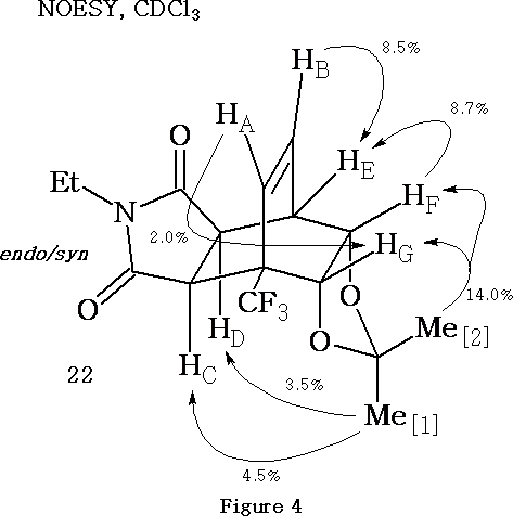 Key, defining NOE relationships exhibited by the endo/syn trifluoromethyl substituted adduct (22, Figure 4) are the enhancement of protons HC and HD by irradiation of the endo methyl group Me[1] and the signal enhancement observed for proton HG when methine proton HA was irradiated.