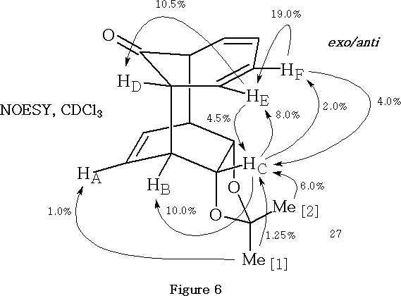 Key, defining NOE relationships, exhibited by the exo/anti adduct (27, Figure 6) , are the enhancement of methine proton HA by irradiation of the endo methyl group Me[1] , the mutual enhancements observed between methine proton HE and proton HC when irradiated in turn and the mutual enhancements observed between methine proton HF and proton HC when irradiated in turn .