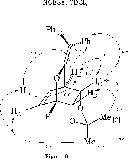 The NOESY results15 for the fluoro[4 + 2] adduct 43 are shown in Figure 8 . Of pivotal importance for structural determination is the relationship between proton HE and protons HB , and HC and Ph[1]. It may be inferred from these relationships that the enol oxygen is bonded to the C-F carbon atom. The proposed overall structure for the Diels-Alder adduct 43 is consistent with the NOESY evidence.