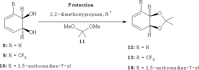Cyclohexadiene- cis -diols 6, 9 and 10 were prepared by biotransformation and subsequently protected as the corresponding acetals 12-14 , Scheme 2 , utilising 2,2-dimethoxypropane 11 under acid catalysis. These protection procedures usually proceed in good yield.