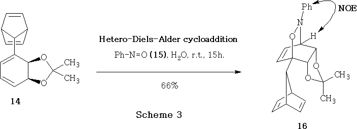 Nitrosobenzene 15 underwent cycloaddition in aqueous medium at ambient temperature with the 7-substituted norbornadiene 14 to give adduct 16 in 66% yield.