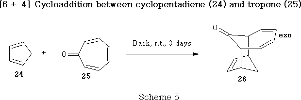One of the triumphs of the concept of the Conservation of Orbital Symmetry, described by Woodward and Hoffmann, was the prediction33 in 1962 of the viability of a concerted [6+ 4] cycloaddition reaction. Four years later this prediction was born out34 by Cookson et al. , who combined cyclopentadiene 24 with tropone 25 to give exo adduct (26, Scheme 5) . These results were shortly afterwards confirmed35 by Itô et al. , who obtained the same product 26 , using slightly different reaction conditions.