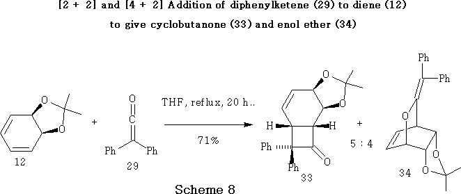 In contrast with the examples shown in Scheme 7 , diphenylketene 29 reacted with diene 12 in a non-specific manner to give not only the expected [2 + 2] adduct 33 as the major product but also a slightly lesser amount of [4 + 2] adduct 34.14,15