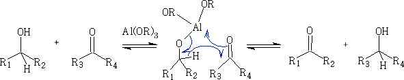This reaction uses an aluminium catalysed H - shift from the CH3CH(OH)CH3 (propan-2-ol) via a 6 membered transition state. The catalyst is usually Al(OiPr)3 (OiPr is propan-2-ol) and is used because one of the products is propanone and this can be removed from the mixture by continuous distillation.