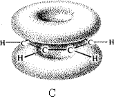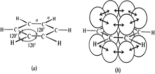 Benzene rings a) with s bonds b) p orbital overlap c) p clouds above and below ring