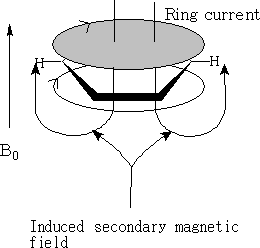 With NMR on applying a magnetic field the ring current induces a secondary magnetic field. The magnetic field felt by the –H on the ring is much greater. The proton is pushed to low field. NMR for the aromatic proton is δ 7.3.