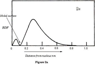 Figure 2a shows the electron density of the 2s orbital as a graph; you will observe the nodal surface that appears at ˜ 0.1nm. p orbitals are dumb-bell shaped; the shapes represent all p orbitals no matter which shell.