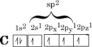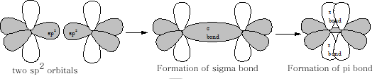 The 2p z orbital is now orthogonal to the 3 sp 2 orbitals {figure11}. What we have now is the set-up for the formation of a double bond in an alkene. Two sp 2 orbitals and 2 p orbitals for the carbon atoms need to come together; the resultant is the formation of a s bond and a p bond (figure 12).