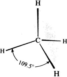 If we apply this to CH4 methane we get the result shown in Figure 8(a). Notice the Hydrogen atoms have moved to the farthest point away from each other; this gives a bond angle of 109.50 {Figure 8b}. This is known as the tetrahedral angle.