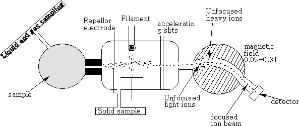Beams of ions are produced from the ion source and separated into individual beams containing ions of a single mass. An accelerator plate with a positive potential of about 2000V is used to accelerate the positive ions down the tube.